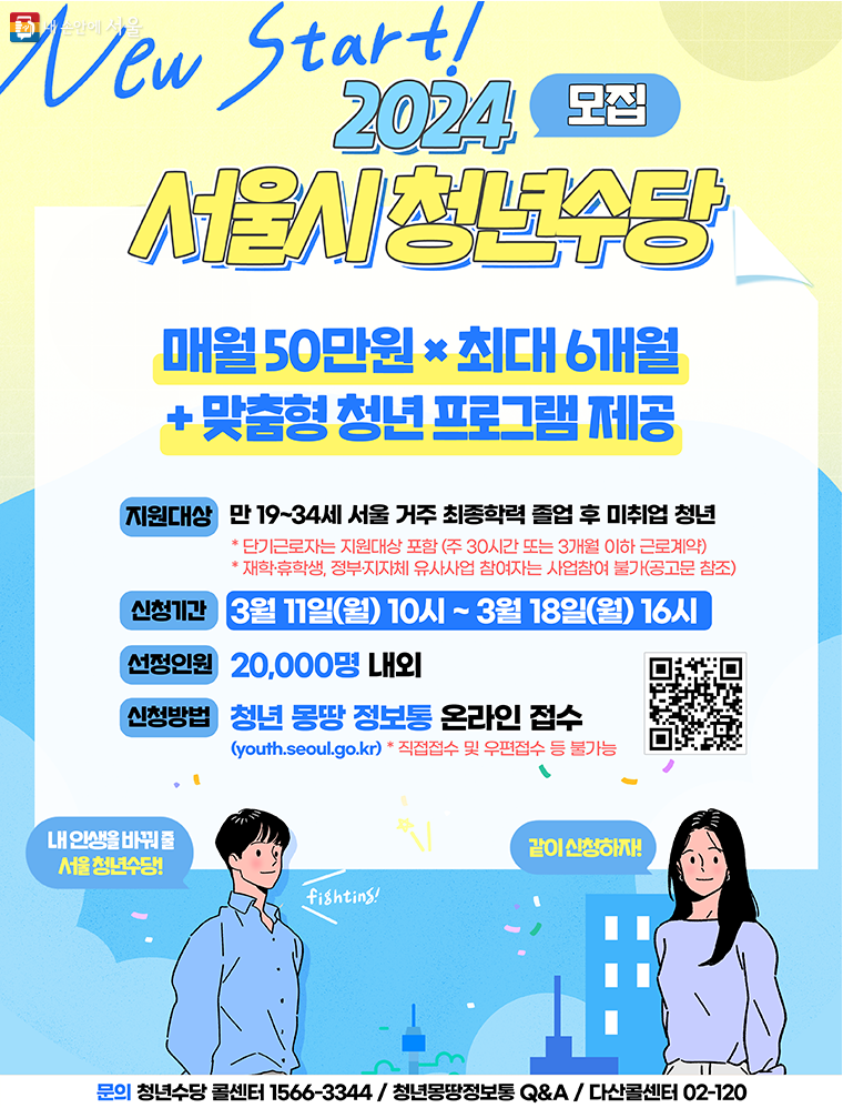 서울시는 ‘2024년 서울 청년수당’ 참여자 2만 명을 3월 11일 오전 10시부터 18일 오후 4시까지 모집한다. 참여 신청은 온라인으로만 가능하며, 청년몽땅정보통 누리집에서 간편하게 할 수 있다.