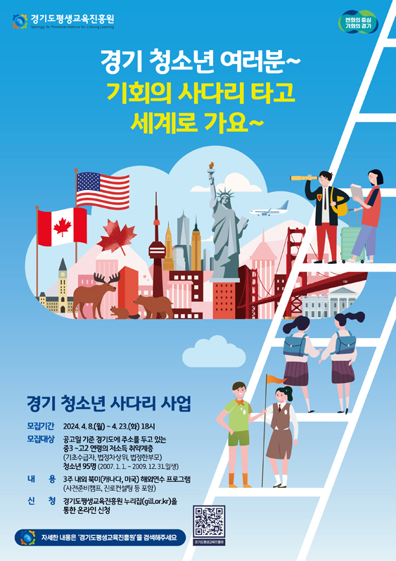 경기도는 8일부터 23일까지 청소년들에게 해외연수의 기회를 제공하는 ‘경기 청소년 사다리’ 사업 참여자 95명을 공개 모집한다고 밝혔습니다.