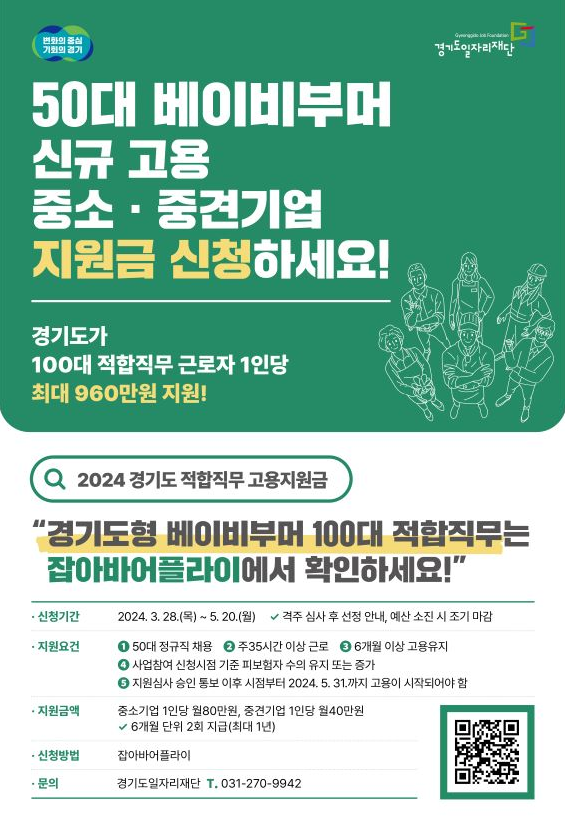 경기도 관계자는 “경기도 적합직무 고용지원금 사업은 도내 중소·중견기업의 인력난 해소에 기여하고 도내 50대 베이비부머들이 기존의 경력을 활용해 지속적인 경제활동을 할 수 있는 마중물이 될 것”이라고 전했습니다.