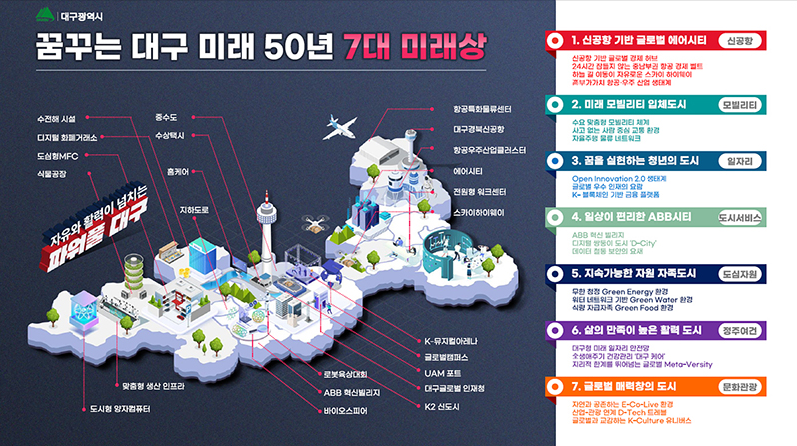 미래 산업·기술과 인구구조 등 정주 여건의 변화와 고령화 등 도시 활력 감소에 대비해 ▲기업과 연계한 대구형 미래 일자리 안전망 구축, ▲전(全) 생애주기 건강관리 체계인 ‘대구케어’ 도입, ▲지리적인 한계를 뛰어넘는 글로벌 메타버시티 조성 등의 전략으로 누구나 살고 싶은 도시의 기반을 조성하고자 했다.