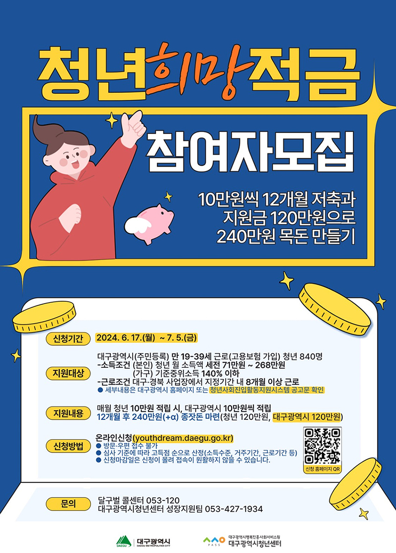 대구광역시는 사회진입 초기의 근로청년들에게 소액자산 형성 경험과 기회를 마련해 주기 위해 ‘2024년 청년희망적금’ 사업 참여자를 모집한다.