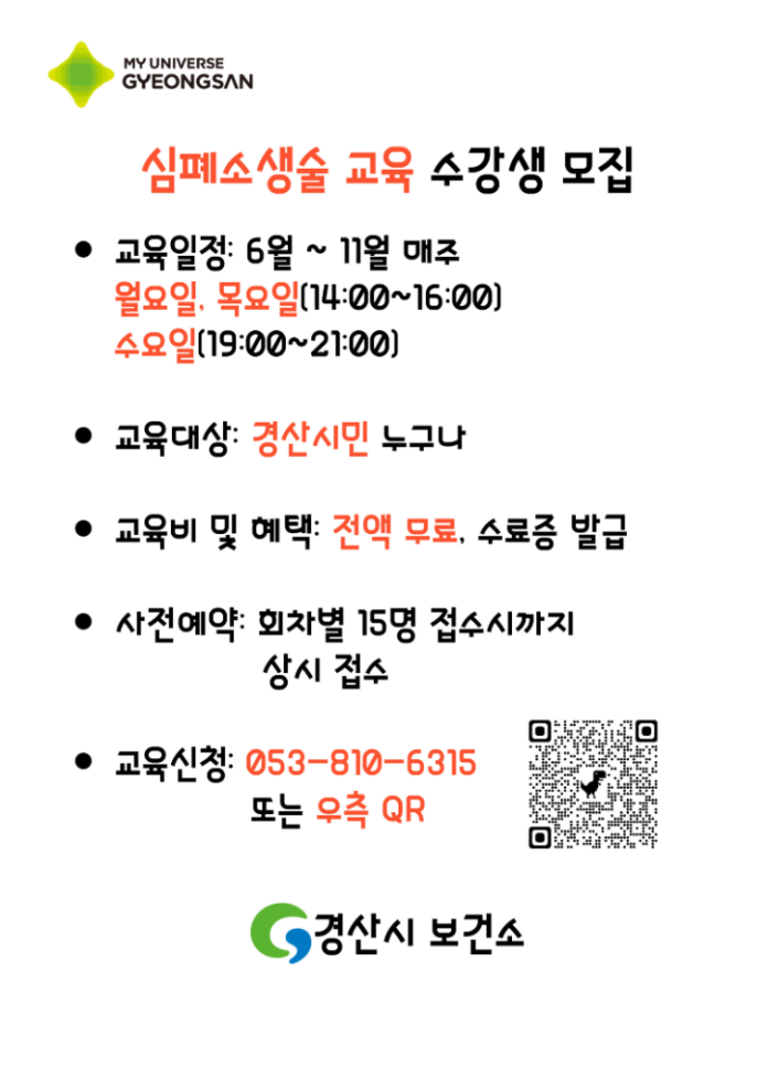 심폐소생술은 누구나 배울 수 있는 기술로 전문가가 아니더라도 경산시보건소에서 실시 중인 교육을 통해 기본적인 심폐소생술 기술을 습득할 수 있다. 교육은 회차당 15명까지 선착순으로 전화(☎053-810-6315) 또는 큐알(QR) 코드를 이용해 예약할 수 있다.