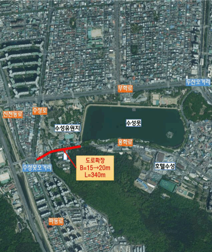 해당 구간은 수성못과 인근 상업시설, 지산·범물지구 등 주요 관광지와 주거지를 연결하는 핵심 접근로임에도 불구하고 도로 폭이 협소해, 평일 출퇴근 시간은 물론 주말에도 잦은 혼잡으로 몸살을 앓던 곳이다.