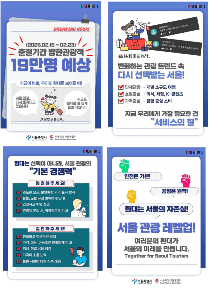○ 서울마이소울샵(서울관광플라자점·서울갤러리점)에서는 2월 21일까지 서울굿즈 구매 고객 대상 신년 연하장·에코백 증정 및 프리미엄 굿즈할인 이벤트를 진행하고, 매장 내 중국어 홍보물을 비치한다.